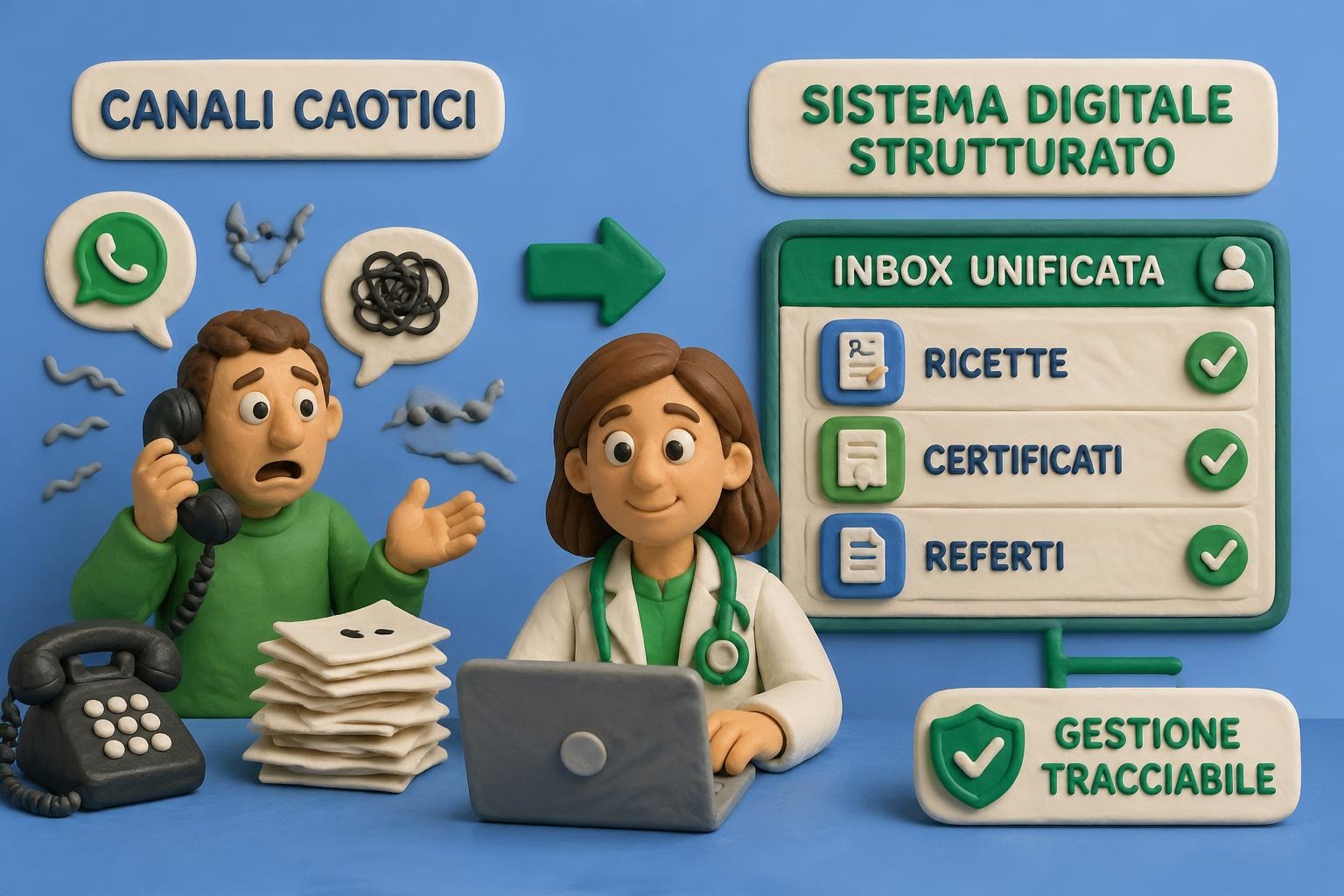 Una soluzione digitale efficace per i medici di medicina generale non può essere semplicemente un'app di messaggistica. Deve invece strutturare il lavoro, trasformando richieste disordinate in flussi tracciabili e gestibili.